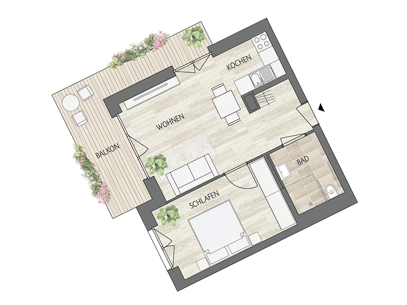 Mehr Platz als man denkt. Optimalen Zuschnitt auf kleinen Raumen bieten die attraktiven 2-Zimmer-Wohnungen mit Blick ins Grüne.