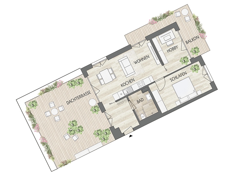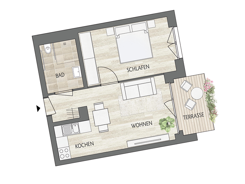 Mehr Platz als man denkt. Optimalen Zuschnitt auf kleinen Raumen bieten die attraktiven 2-Zimmer-Wohnungen mit Blick ins Grüne.